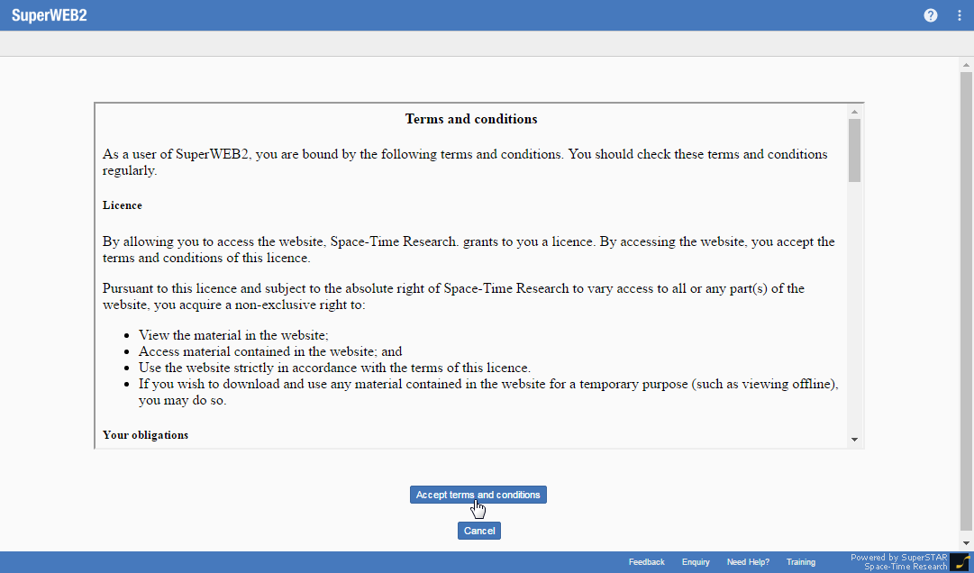 It is possible to configure SuperWEB2 to display a terms and conditions screen during log in. Users will need to accept the terms and conditions in order to log in to SuperWEB2. For example: