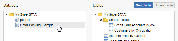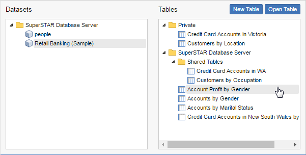 - The Tables list displays saved tables for the currently selected dataset. Saved tables include: