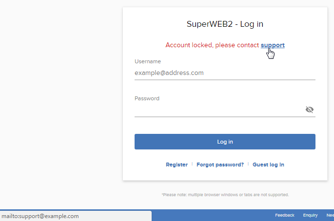 There are some login error messages included with SuperWEB2 that contain an email address link for the user to contact support. For example: