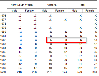 | With the above threshold rules, the low value cells are concealed. In the highlighted cells, values of 6 and 8 in regular table cells have not been concealed (as they are above 5). However, a value of 8 has been concealed in the total column.