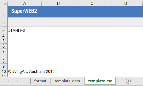 | template_data | This work sheet will be used as the template for a standard table download. It can contain any content you like, but must include the string #TABLE# somewhere on the worksheet. SuperWEB2 will replace #TABLE# and up to 5 rows after that with the table data and associated messages such as the table title and any annotations. If you want to include any messaging at the bottom of your download (such as a copyright statement or attribution) then you should make sure it is far enough down your template file so that it does not get overwritten by the table data. | ![]() | ||||||||||||||||||||