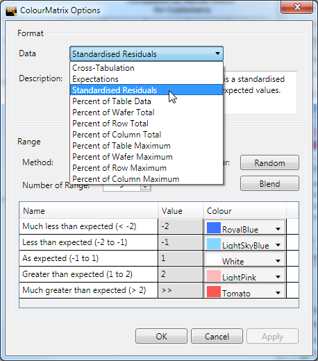 | Standardised Residuals | Show the standardised residuals. This is a standardised measure (z-value) of deviation from the expected values. See ColourMatrix Statistical Overview for more details about how this is calculated. |