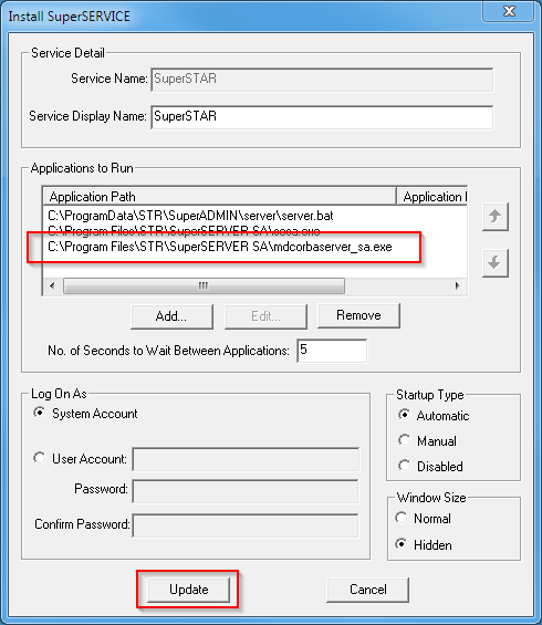 - Click the ... button and select the mdcorbaserver_sa.exe executable. If you installed SuperSERVER to the default location this is located in C:\Program Files\STR\SuperSERVER SA.