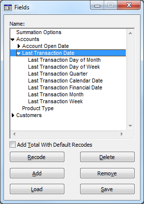 This example has groups for the fields relating to account opening and the last transaction: