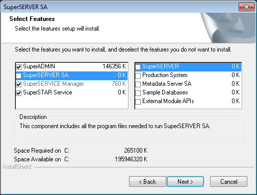 When you are prompted to select the components to install, select everything except SuperSERVER SA: