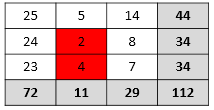| Consequential Cell Suppression | Often, it is necessary to conceal other cells as well, otherwise the column and row totals might reveal the real values of the suppressed cells. For example, suppose the data publisher chooses to suppress all cell values under 5. In the following example, that would mean suppressing the values 2 and 4 (highlighted in red):