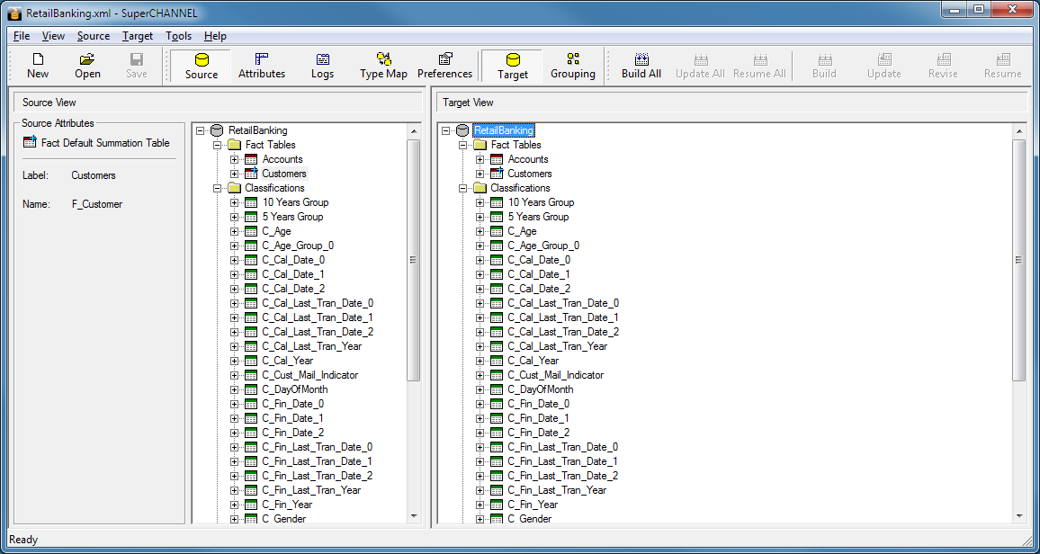 The following is an example of SuperCHANNEL in update mode. The previously mapped columns are greyed out in the Target View: