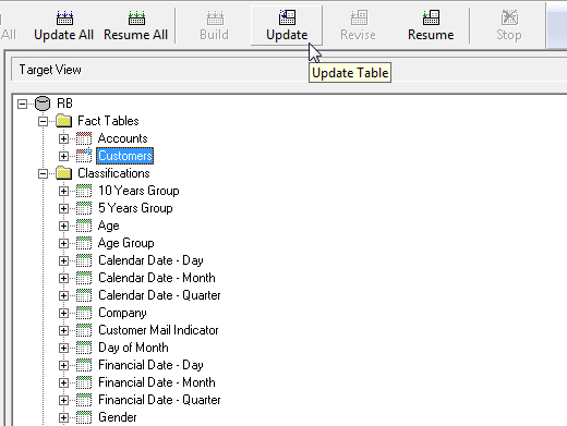 You are strongly recommended to use the Update option to update the fact tables individually, rather than Update All (which updates all the fact and classification tables in the target). If you need to update all the tables, consider rebuilding the database instead as this will be more efficient.