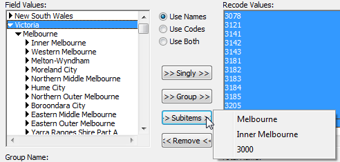 Use the buttons (>> Singly >>, >> Group >> and >> Subitems >>) to move values from the Field Values list to the Recode Values list. Only the Recode Values will be displayed when you use the recode in a cross tabulation.