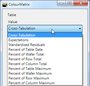 Percent of Table Data / Wafer Total / Row Total / Column Total | Determine the colours by calculating the value of each cell as a percentage of the table total, wafer total, row total or column total. |