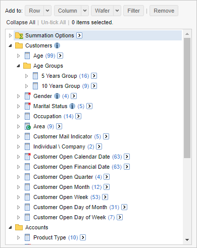 An individual item within a field, such as Male or Married. If this field is a hierarchy, then you can click the field item to see the items at the next level in the hierarchy.