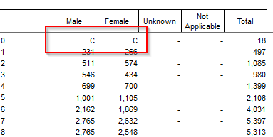 Age by Gender, values 10 and under are concealed: