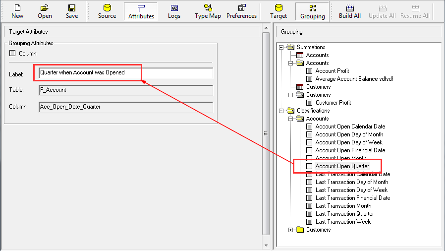 You can also use the Grouping tool in conjunction with the Target Attributes pane to change the labels of the fields and measures in your database.