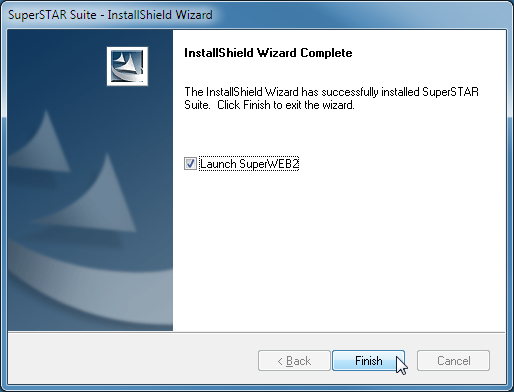 When the installer is finished, the Wizard Complete window displays. Keep the Launch SuperWEB2 check box selected, and click Finish: