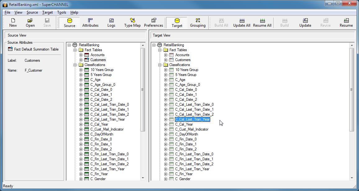 The following is an example of SuperCHANNEL in update mode. The previously mapped columns are greyed out in the Target View: