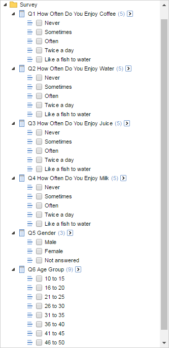 In this example, questions V1 to V4 have the same possible answers. The order in which the questions are specified in the DATA LIST section is used to determine which questions are consecutive and are therefore implied by V1 TO V4.
