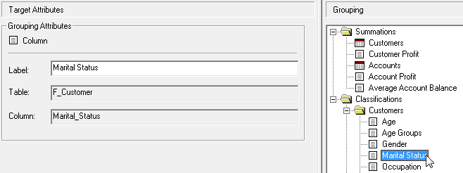 For example, the Customer table has a column containing the customer's date of birth. To include this in the build, select the column in the Target View, then select the Included in Build check box and the Plain usage type: