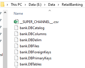 <dataset_id>is determined by the TDD control files in the selected directory. In this example, the TDD is located in the directory E:\Data\RetailBanking and the TDD control files are named bank.DBCatalog, bank.DBColumns, and so on:
