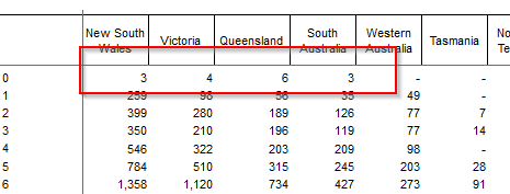 | With the above threshold rules, the low value cells are concealed. In the highlighted cells, values of 6 and 8 in regular table cells have not been concealed (as they are above 5). However, a value of 8 has been concealed in the total column.