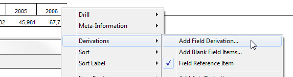 - To forecast the data for 2007, insert a field derivation by right-clicking on the column headings and selecting Derivations > Add Field Derivation.