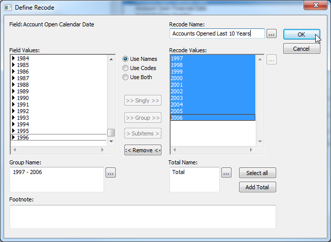 - The first step is to create a recode showing the number of accounts opened over the last ten years (the recode is not necessary for the forecast, but it makes it easier to view the data in a table).