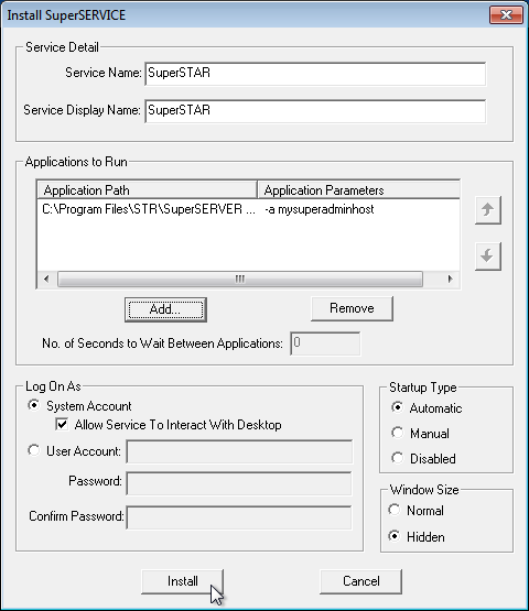 In the Service Name and Service Display Name fields, enter SuperSTAR.