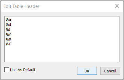 The header and footer can have a maximum of 244 characters. You can use the following special codes to display dynamic information about the table: