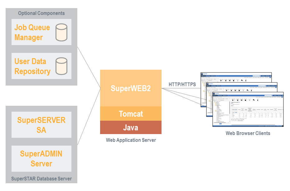 SuperWEB2 runs within a Java based web application container (Tomcat), and can use a RDBMS to store user saved tables and large queries pending download by the user.