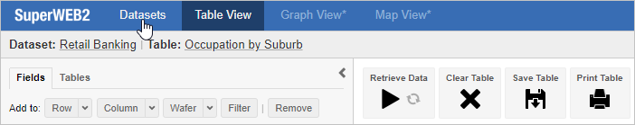 You can also access saved tables from the Datasets tab. This is displayed when you log in to SuperWEB2, or whenever you click the Datasets link in the top left corner: