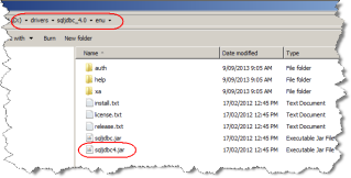The driver JAR files themselves are unpacked under a directory that depends on the language you chose for the download. For example, here the directory is enu, as an English download was chosen.