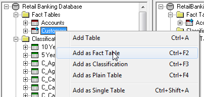 The first step is to define the fact tables. In this example there are two fact tables: Accounts and Customers.