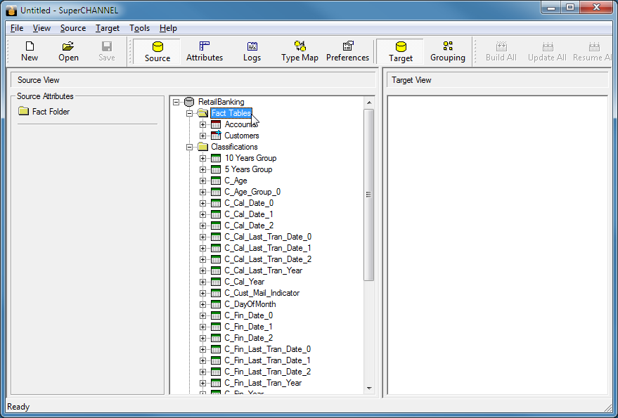 SuperCHANNEL connects to your source database and displays the tables and columns in the Source View pane:
