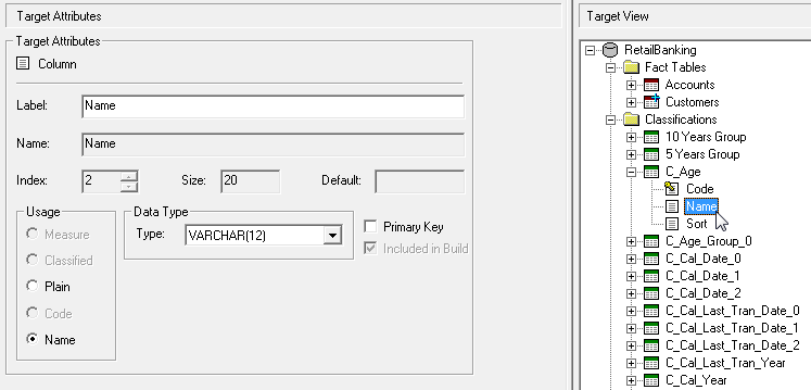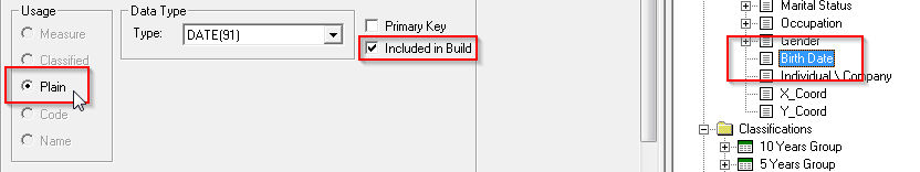 For example, the Customer table has a column containing the customer's date of birth. To include this in the build, select the column in the Target View, then select the Included in Build check box and the Plain usage type: