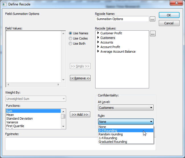 - Select each summation option in the Recode Values list in turn and select the confidentiality rule from the drop-down list. For full details on how each rule works, see Recode Reference.