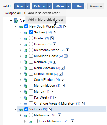 For example, if you select Sydney, then New South Wales, then Victoria, and then click Row, SuperWEB2 will add them in that order: