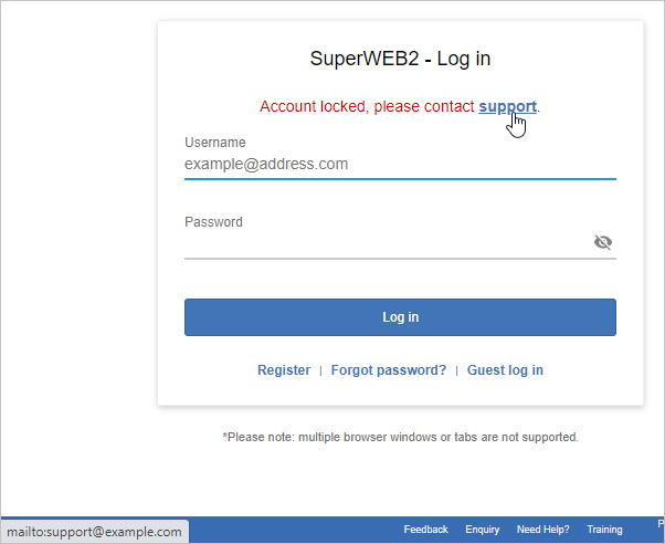There are some login error messages included with SuperWEB2 that contain an email address link for the user to contact support. For example: