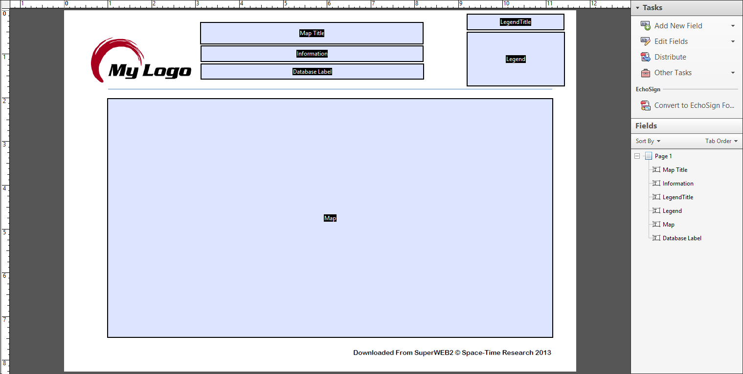 Position the form fields where you want to items to appear on the page. You will typically want to make the Map field the biggest and most prominent, because this is where the map or graph will be placed in the document.