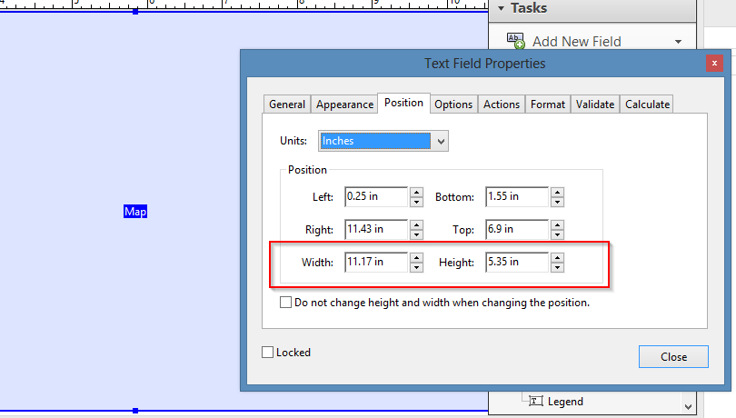 - Make a note of the Width and Height of the Map field in inches. You need these values to tell SuperWEB2 how big to generate the graph image that will be placed in the PDF.