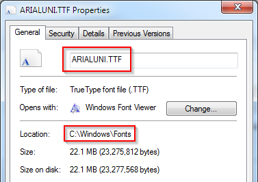 CODEpdfTemplateFonts=C:/Windows/Fonts/ARIALUNI.TTF,C:/Windows/Fonts/mingliu.ttcTo obtain the full path to a font installed on your computer, go to Control Panel > Appearance and Personalisation > Fonts, then right-click the font and select Properties: