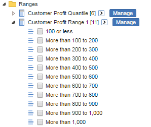 User defined ranges appear in the Ranges section of the field tree. By default, the different types are automatically labelled as follows: