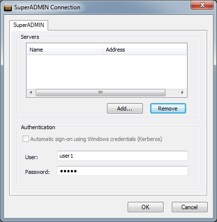 Select File > SuperADMIN Connection. The SuperADMIN Connection window displays.