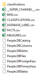 The dataset ID is indicated by the TDD control files, which will be located inside the selected TDD directory. The control files contain information about the structure of the dataset (such as which files contain data, details about the separator character in these files, and so on). The control files include the dataset ID in their filename, which is in the format <dataset_id>.<control_file_type. In the example used here, the control files are People.DBCatalog, People.DBColumns, and so on: