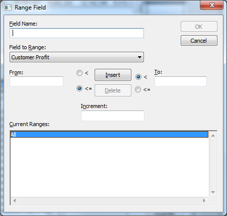 A range field consists of one or more custom ranges (for example "Account Balance < $500", "Account Balance $500 - $1000", "Account Balance > $1000").