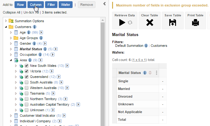 You can use the field exclusion rules to limit the number of fields from a defined group that can be added to the table at any one time. This feature is typically used to restrict the number of sub-state geographies that can be added into a table at the one time.