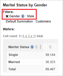 The following version of the table has two filters added. With the addition of these filters, the values in the table will now only count individuals who are both Male and Married: