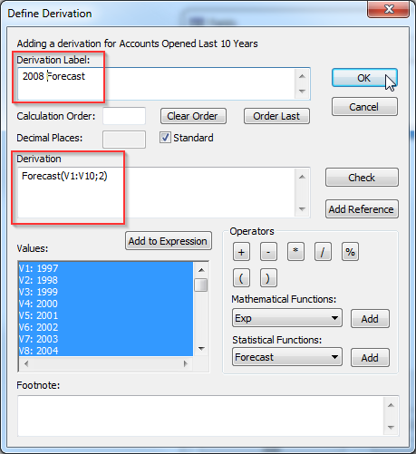 In this example the formula for the forecast is Forecast(V1:V10;1). The first argument to the Forecast function tells SuperCROSS which values to use for the calculation (in this case values V1 to V10). The second argument tells SuperCROSS which period to calculate (in this case it is 1, which indicates the first time period after the end of the periods used for the calculation). - Click OK. The forecast is added to the table.