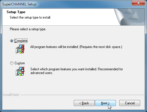 The only difference between the installation types is that Complete installs to the default directory locations, while Custom allows you to choose the location of the SuperCHANNEL program files and program data files. If you choose a Complete installation, the files will be installed as follows: