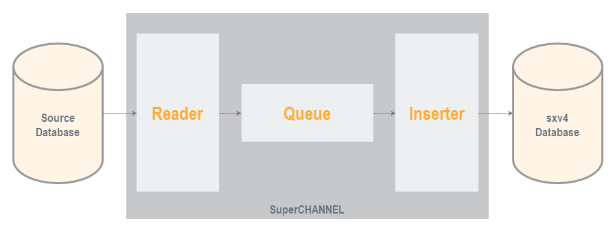 The following diagram shows a simplified overview of the components that SuperCHANNEL uses to convert from your source database to the target sxv4 format: