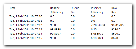 | Queue Size | The number of rows currently waiting in the queue between the Reader and the Inserter. |