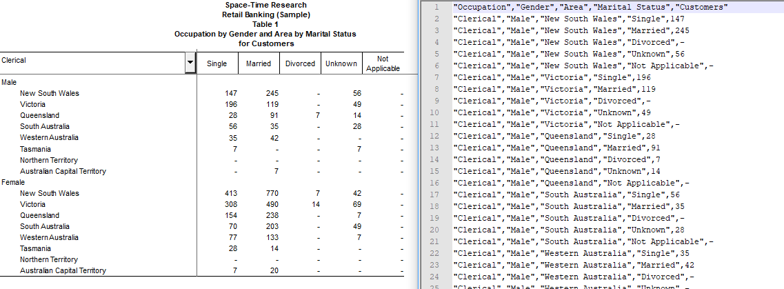 | Flattened Tabular Macro-data (.CSV) | The table data, in flattened CSV format. This format is similar to the other CSV output formats except that all fields (including fields on the columns) are flattened into the rows. It includes a single header row that identifies the contents of the columns, but does not include the SuperCROSS header and footer or any annotations. Features such as sorting and ordering are also removed from the table before saving. If your table contains any concatenated fields, these will be separated by a pipe character in the header row ( For example: